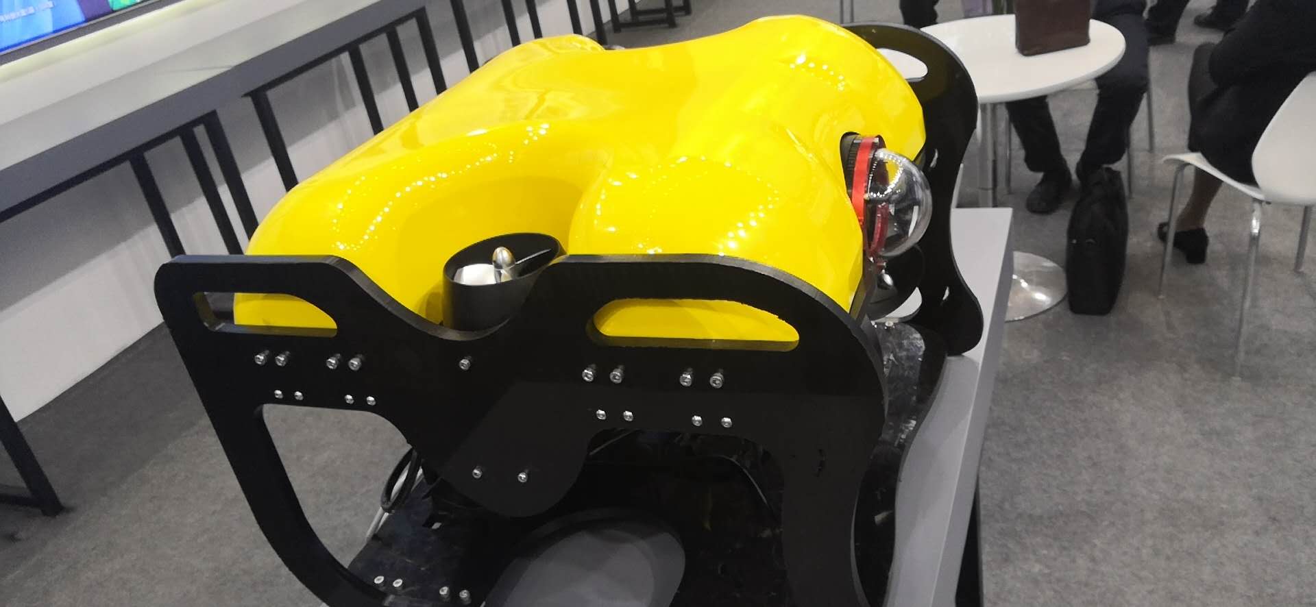 本次展会展出的水下机器人用于船舶外板检测,在展会上吸引了众多观众参观。该船体检测水下机器人总重28kg,尺寸长×宽×高分别为550mm×500mm×340mm,前向推力为34kg,垂向推力18kg,具有显著的抗风和抗流能力。另外该水下机器人搭载多摄像头,在水下视野广阔,操控便捷。同时,该水下机器人还融合了图像增强算法,成功克服了由于不同光在海水中的透过率不同导致的对比度低,色彩偏移等成像缺点。此外该机器人还可以搭载多波束侧扫声呐和空化射流装备,可以更精确的获得船体表面信息以及对船体表面进行清理。